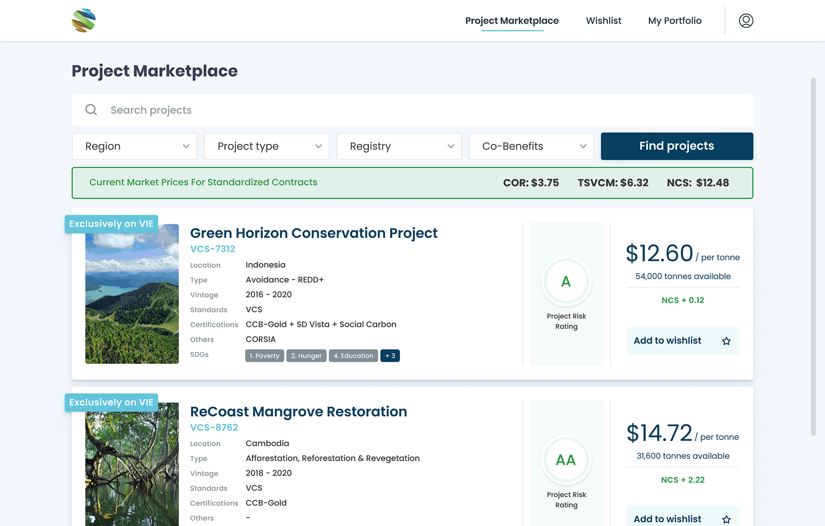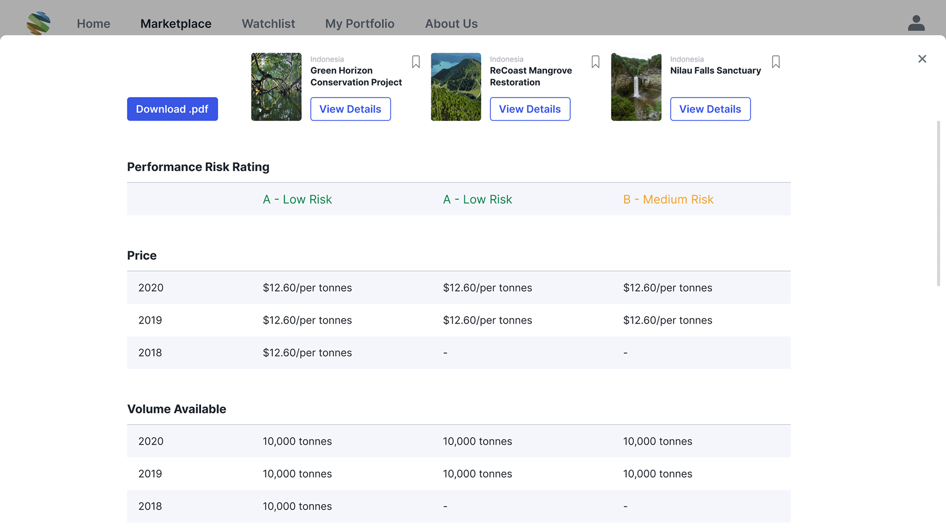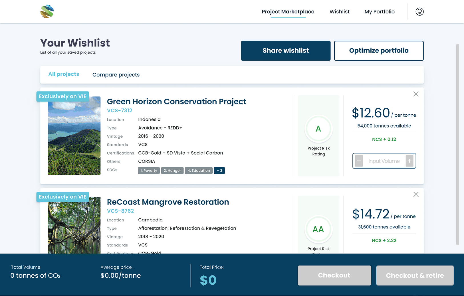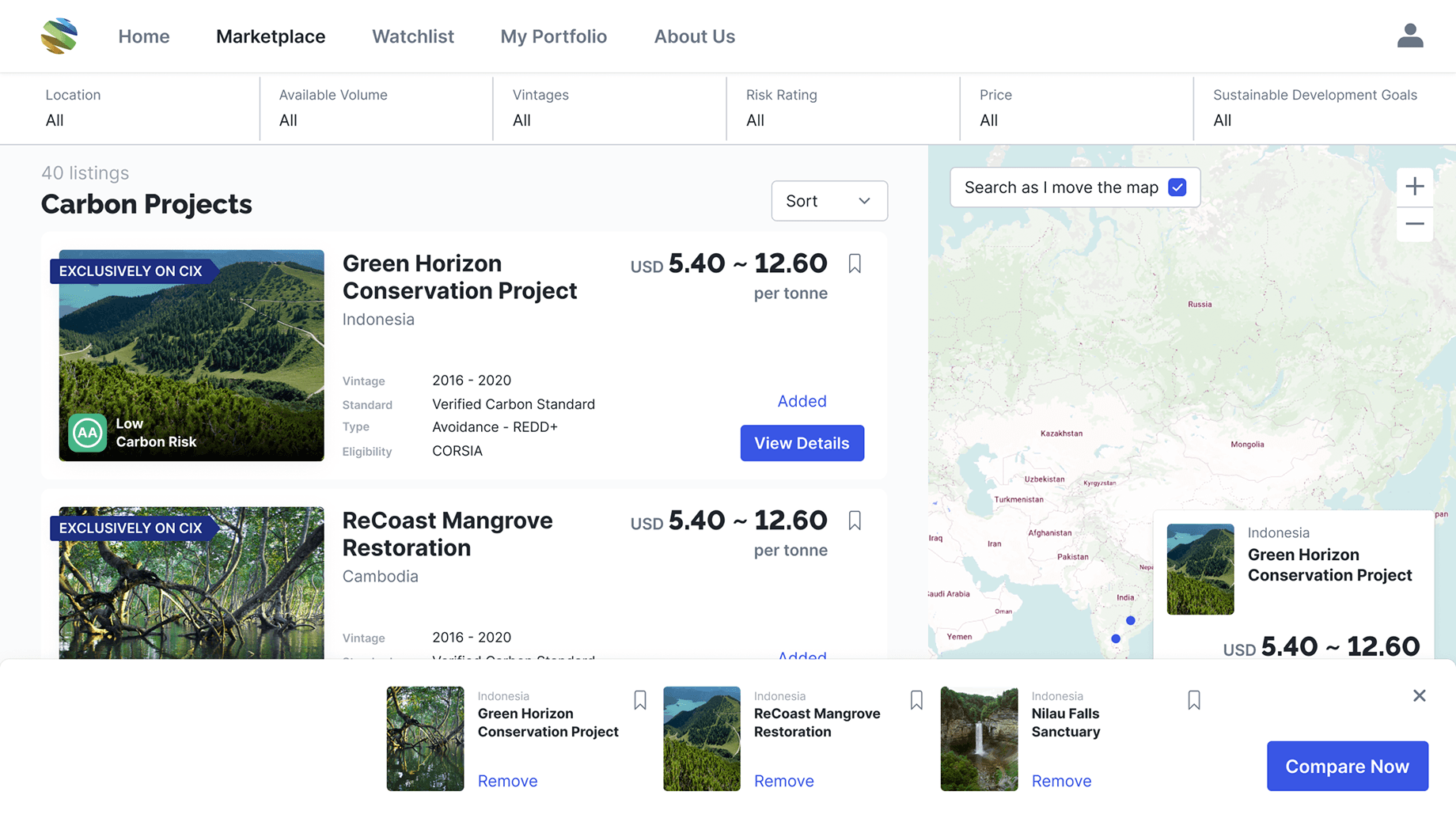 Buyers want to compare similar projects side-by-side to understand differences in pricing, certification, and SDG alignment.