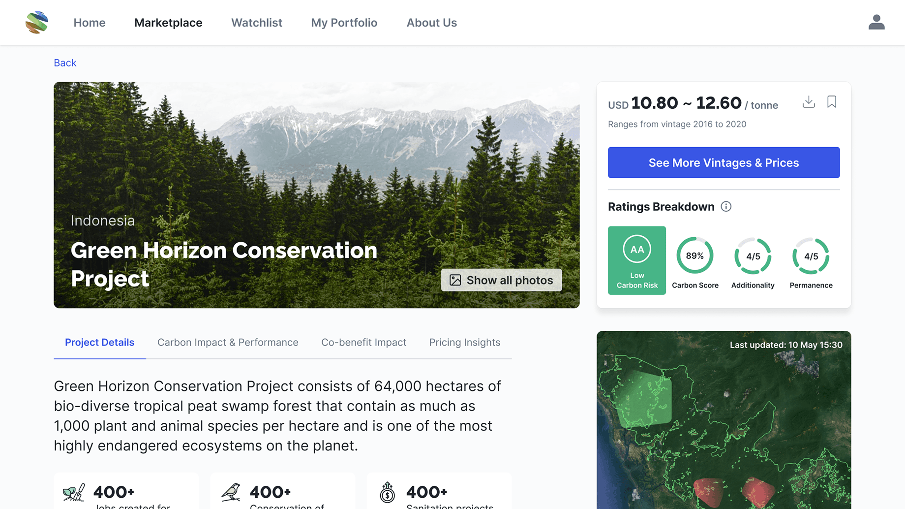 Design Changes: Introduced tabbed sections for clarity - Project Details, Impact & Performance, Co-benefits, Pricing Insights.