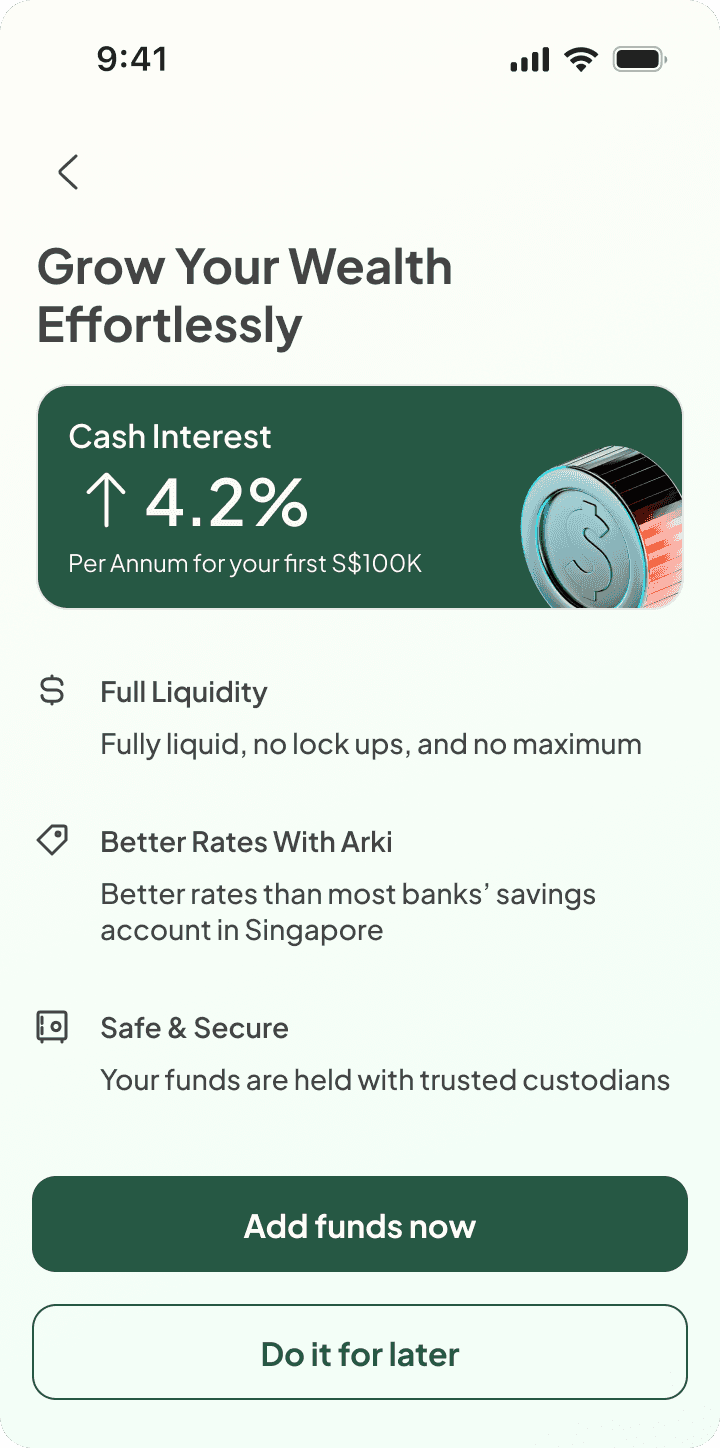 Design Rationale: Instead of funnelling users immediately into action after onboarding (i.e. account setup & dynamic questionnaire), I kept Arki’s investment recommendations pinned to the dashboard. This acknowledged real behaviour as users often pause to explore, reflect, or do research before committing. By keeping suggestions front and centre, we encouraged return engagement without pressure.