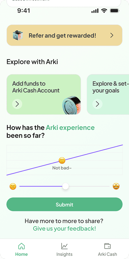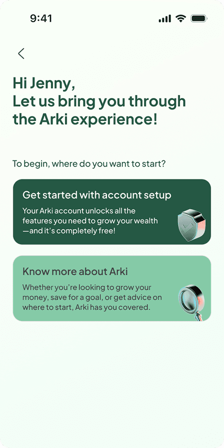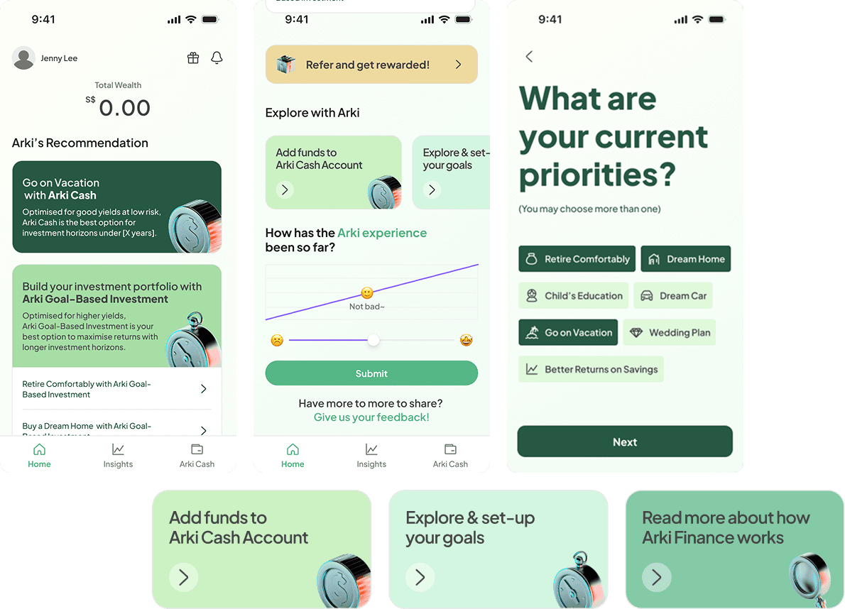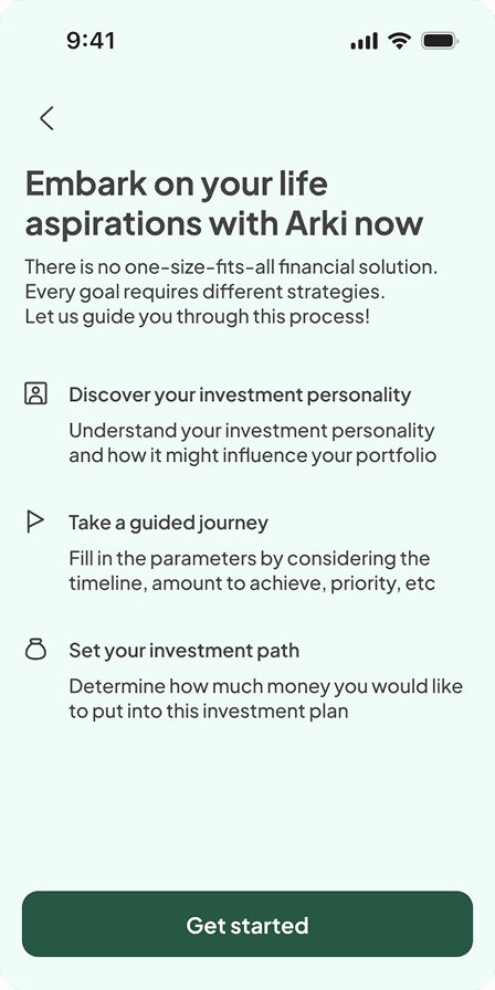 When I joined Arki, there wasn’t a specific user problem to solve. Instead, the team saw a gap in the market, where no investment app at the time was championing goal-based investing for mass affluent users. Their vision was to build a personalised robo-advisory app that could behave like a real financial planner: helping users set goals and plan how to achieve them based on their income, savings, and lifestyle needs.