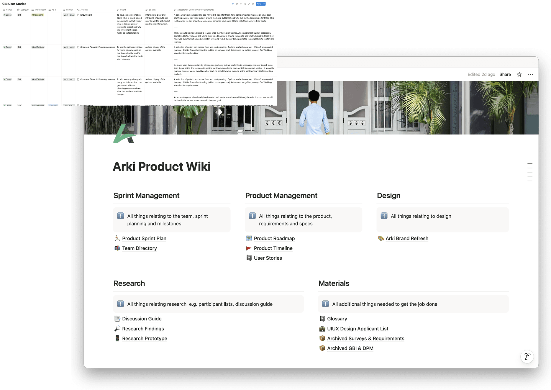 To manage scope, timelines, and constant change, I structured the project into clear workflows and phases. Creating a Notion Wiki, it houses all project related items including user story template to gather and prioritise requirements using MoSCoW method, discussion guides and track project sprints.
