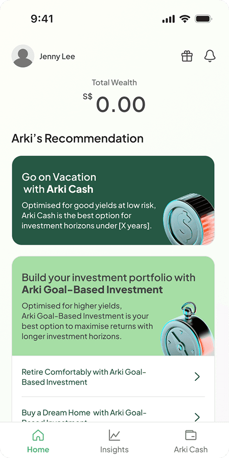 Arki is a Singapore-based startup building a personalised, goal-based robo-advisory app aimed at mass affluent users. The ambition was to help users invest toward life goals, such as retirement, property, education, and more, through tailored recommendations and a human-like experience. As the sole designer, PM, and UX strategist on this project, I was responsible for defining the user experience, refreshing the visual branding, and delivering a seamless