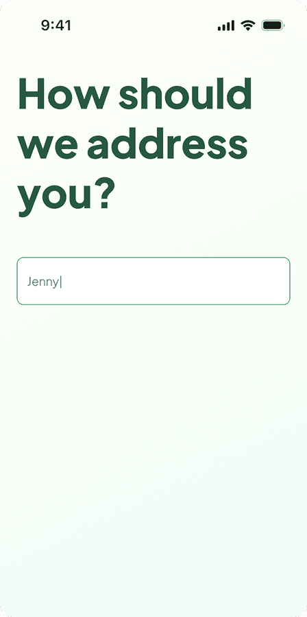 Design Rationale: We made onboarding feel more conversational by asking for the user’s name and using it in subsequent steps. This added a layer of friendliness and personalisation from the start.